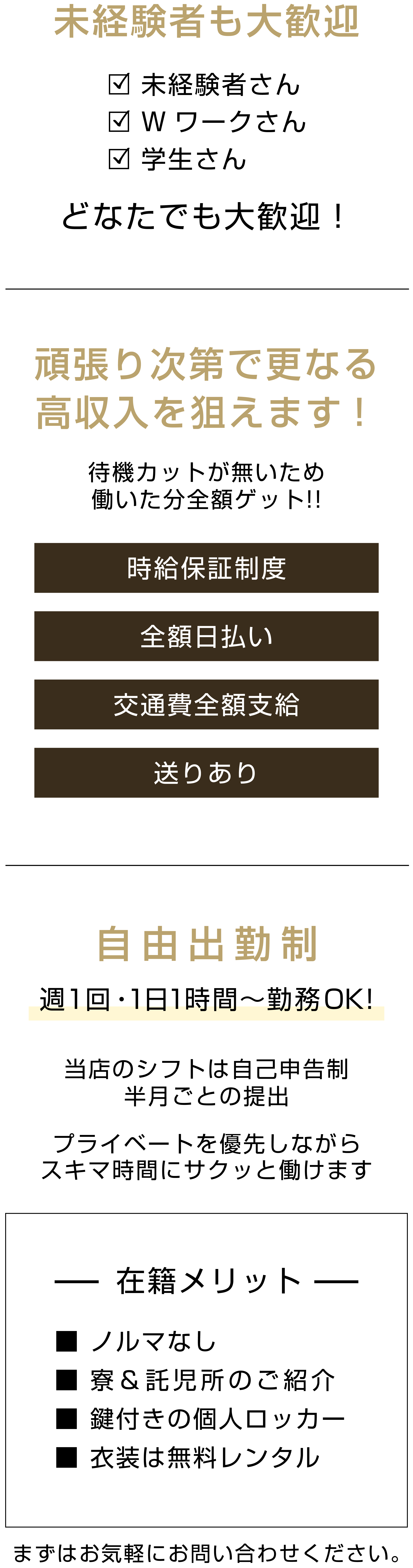 勤務時間 | 20:00〜LAST 1日1時間〜OK |
